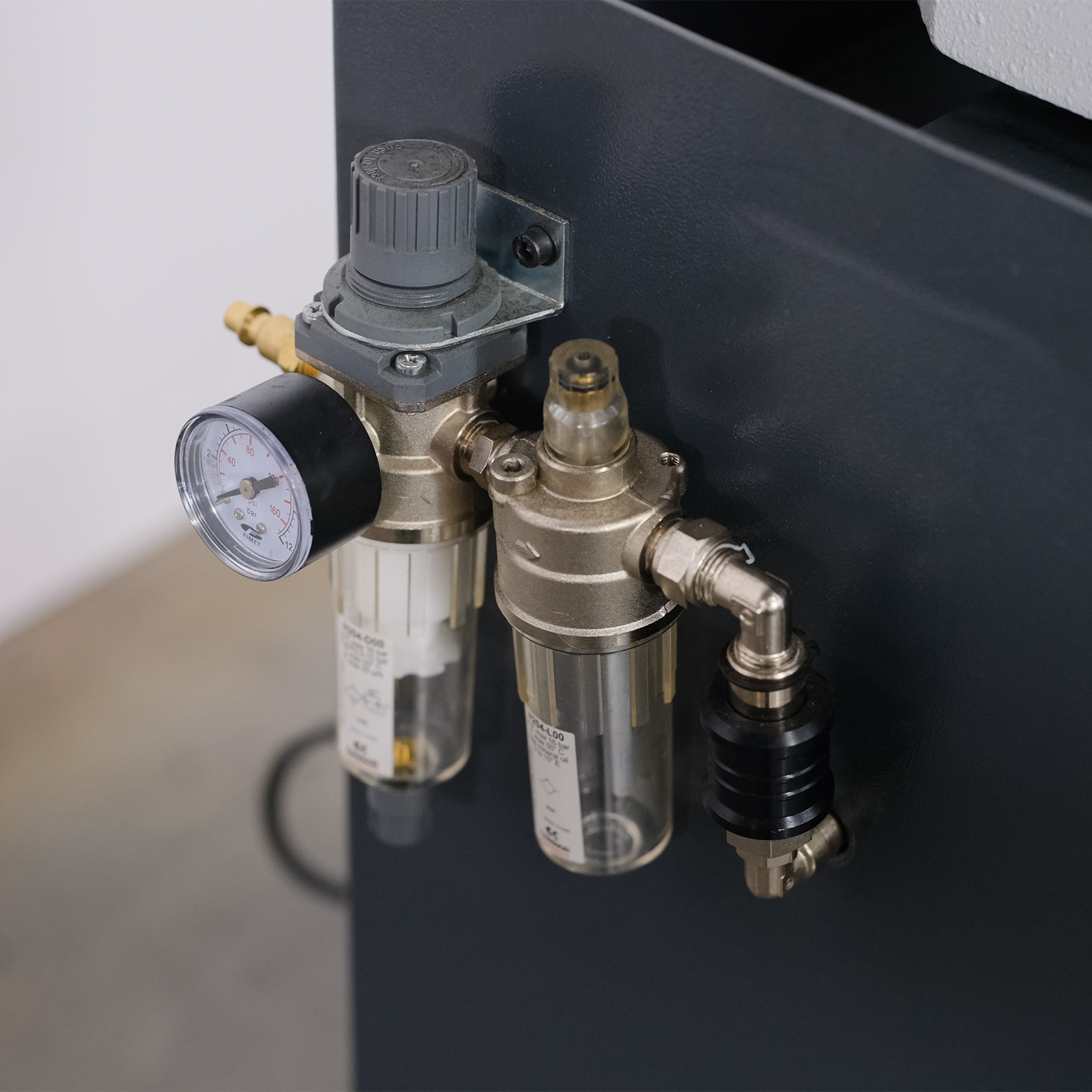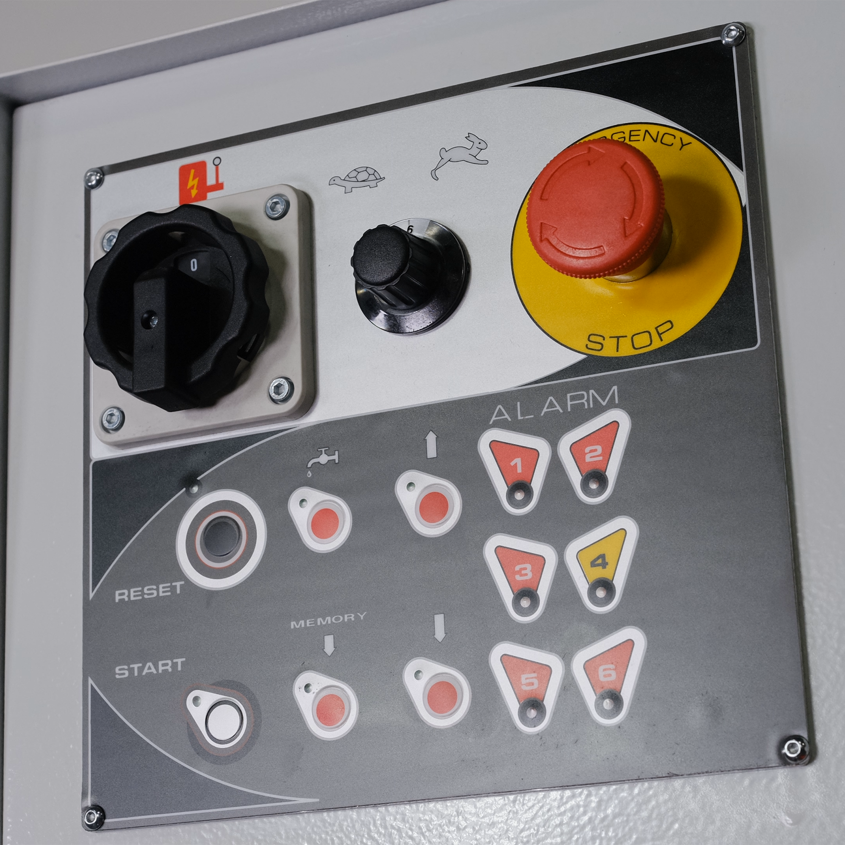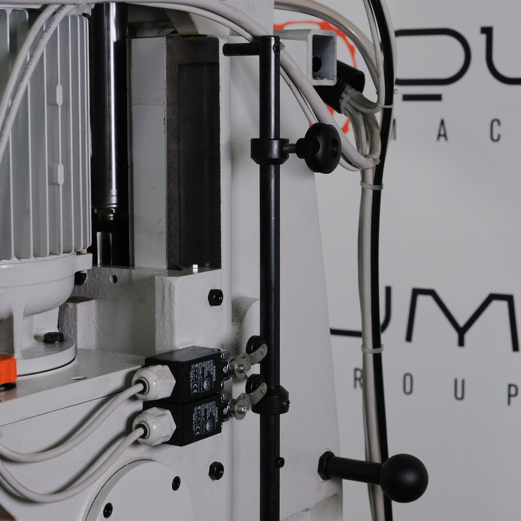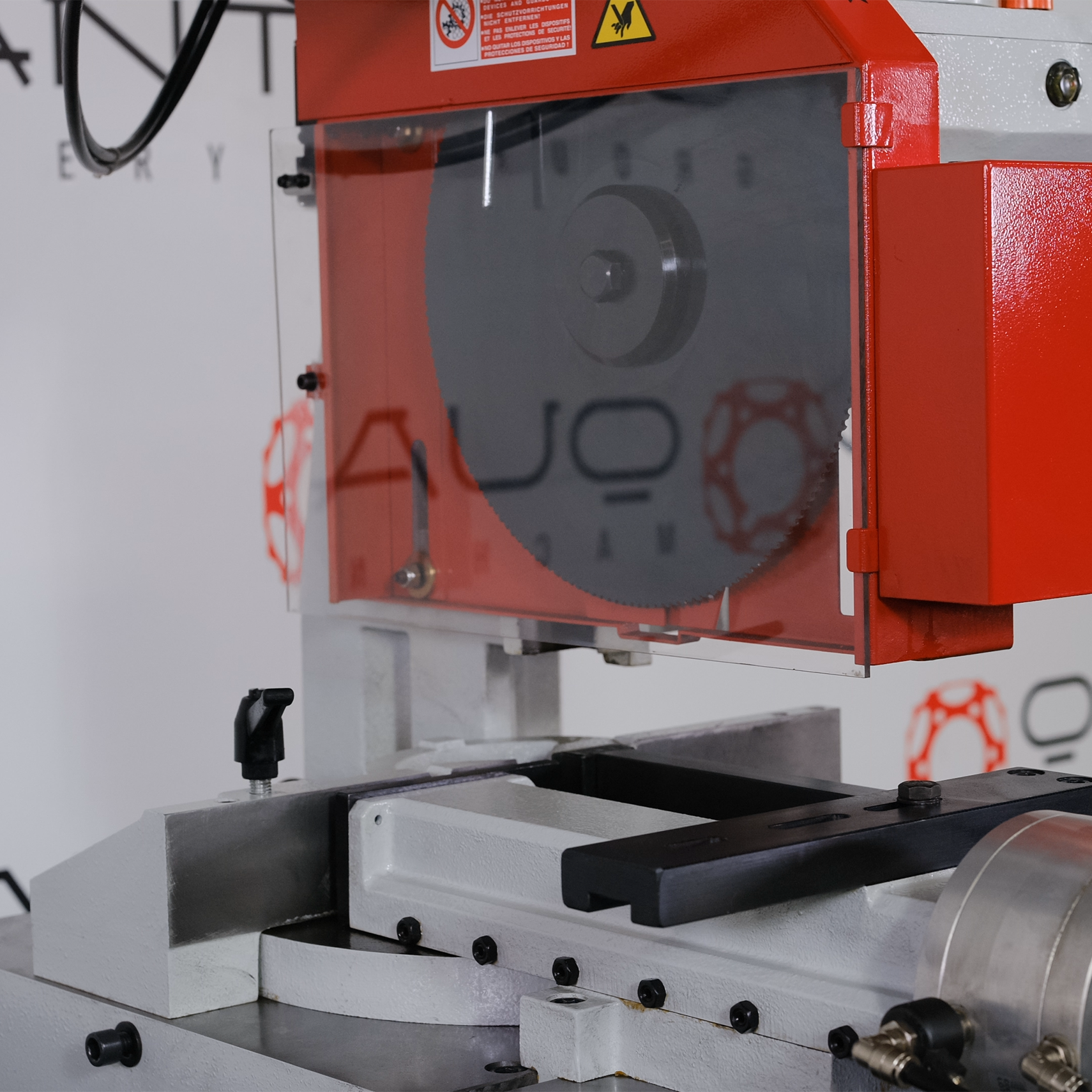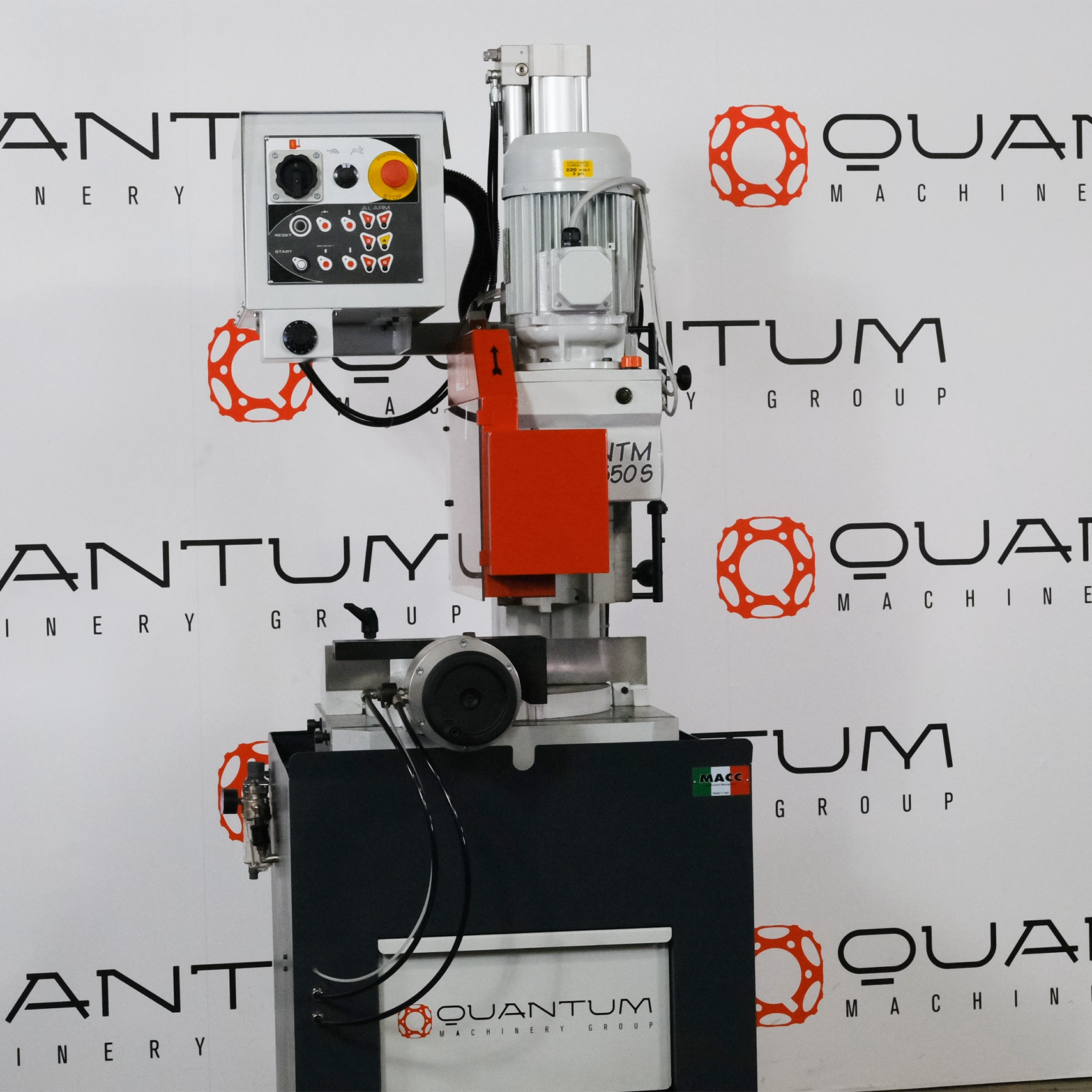 The Quantum Macc NTM 350-S Vertical Semi-Automatic Cold Saw has a moveable head that can move up to 45 degrees left and 60 degrees right; and the head also has rotation stops at 45° - 0° - 45° - 60°. The NTM 350-S has a vice that is complete with an anti-burr device, motor pump for blade lubrication, shave breaker to keep the blade clean. This unit is equipped with a a 1 meter long bar stop, 1 meter long bar support arm, and service tools, as well as the machine's manual and steel pedestal. Electrical: The NTM 350-S can be brought in at either 220 Volt / 3 Phase / 60Hz or 480 Volt / 3 Phase / 60Hz.
